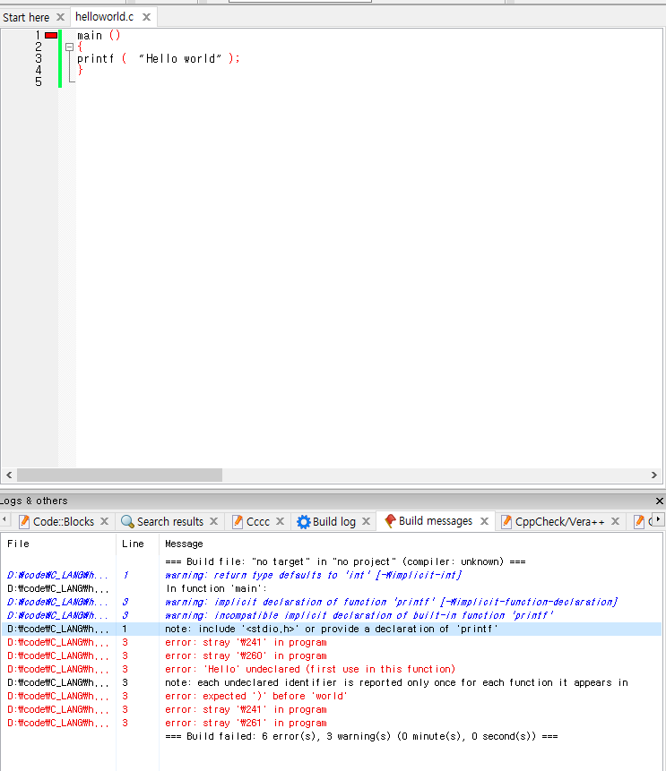 헤더파일 없이 만들면 stdio.h라는 라이브러리가 필요하다고 하네요.