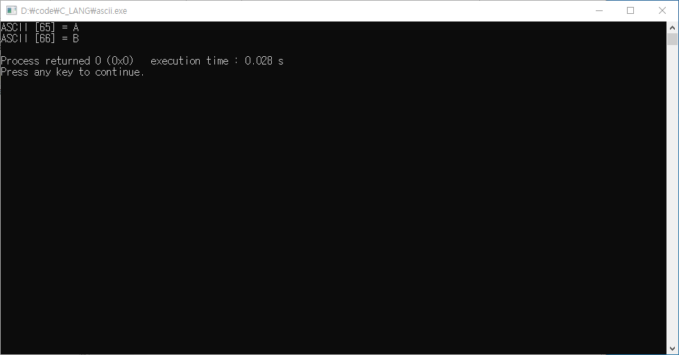 %d를 통해 정수로 출력이 되어 아스키코드상으로는 각각 65와 66으로 출력이 되었으며 그 값은 서식 %c에 의해 문자로 변환되었을때는 각각 A와 B로 출력이 됩니다.