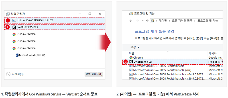 - 작업관리자의 프로세스 탭에서 ① Goji → ② VestCert를 반드시 순서대로 종료