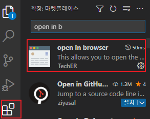 그리고 아까와 같이 마켓 플레이스에서 'open in brower' 를 설치해준다.